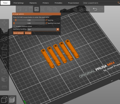 PrusaSlicer has a “hidden” setting that allows you specify the distance between parts. Just right-click the “Arrange” button and set your own settings. I use 2mm spacing and enable rotations.